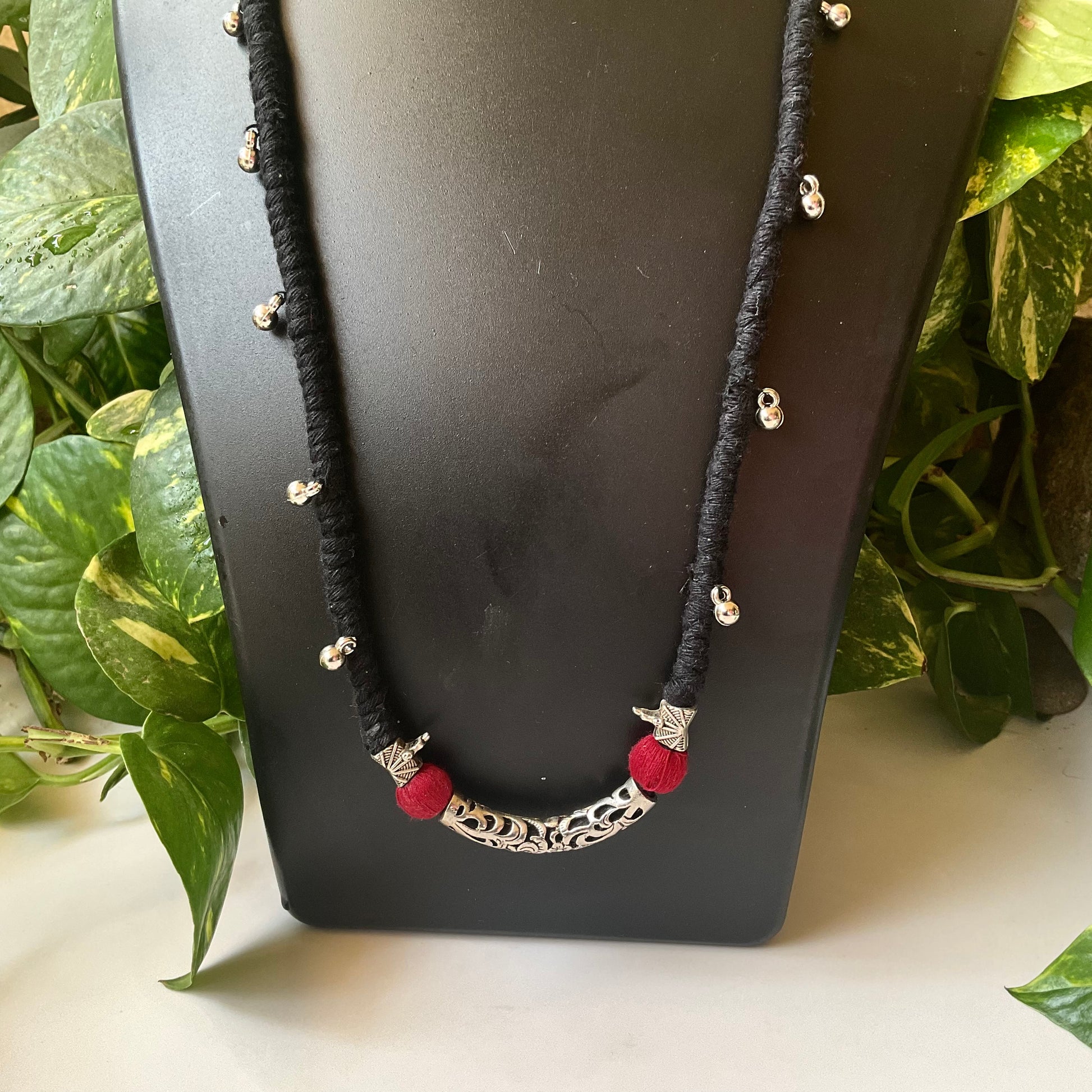 Handmade Ethnic Necklace – Red & Black with Silver Beads, Ghungroo & Macrame Pendant